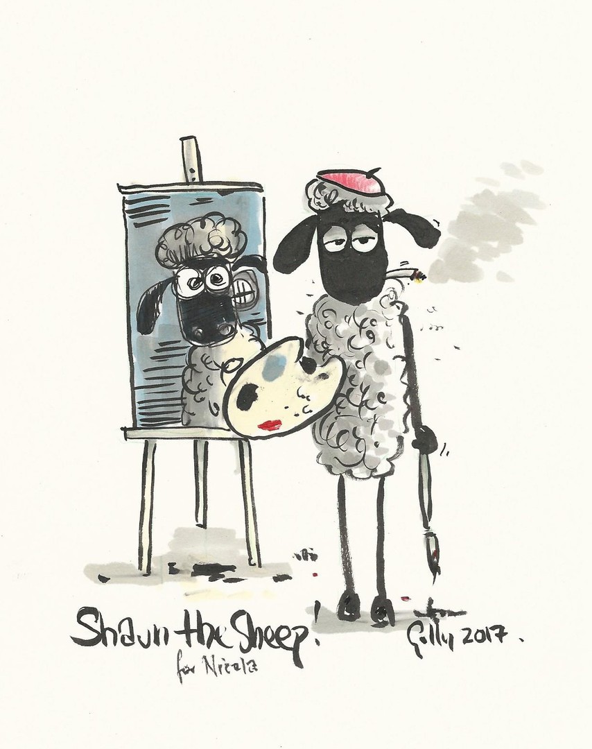 "In March 2017 Richard Starzak (known as Golly) of Aardman and Shaun the Sheep fame bought one of my paintings. He very kindly sent me the drawing on the left which shows clearly that this is a sheep with much talent.