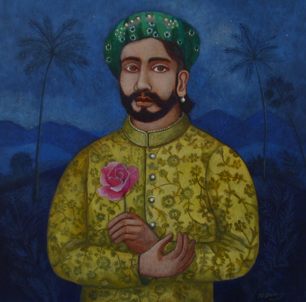 Durga is a major deity in Hinduism. She is known as a Mother Goddess; a Goddess of Preservation, and for Strength and Protection. Usually depicted with eight arms and weapons, in this painting she is imagined relaxing together with her companion.